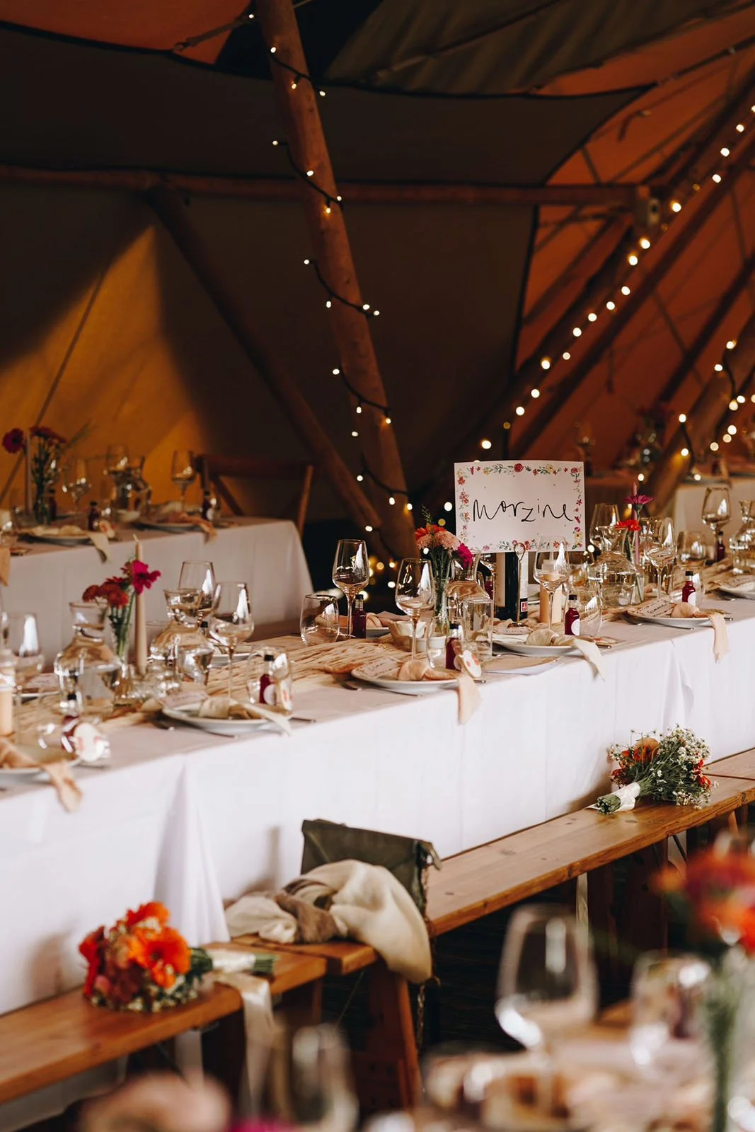 Casey & Max married in a quaint English church and celebrated afterwards in a twinkling teepee. Warm oranges, pinks and yellows made up their floral arch which was carried through from their invitation design. These two love skiing, so I added a few mountain motifs to their table plan and their much loved Labrador, Reggie, featured on the back of their invitation.